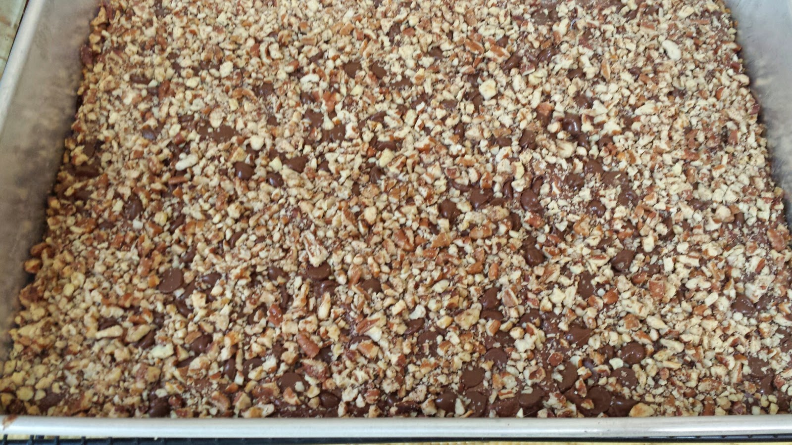I actually made these Chocolate Nut Bars two days in a row. They are so good and so, so easy. I made them Monday for my husband to take to the tax office at Fort Leavenworth and then again yesterday morning to take to Hillcrest Thrift Shop to share with the other volunteers downstairs.