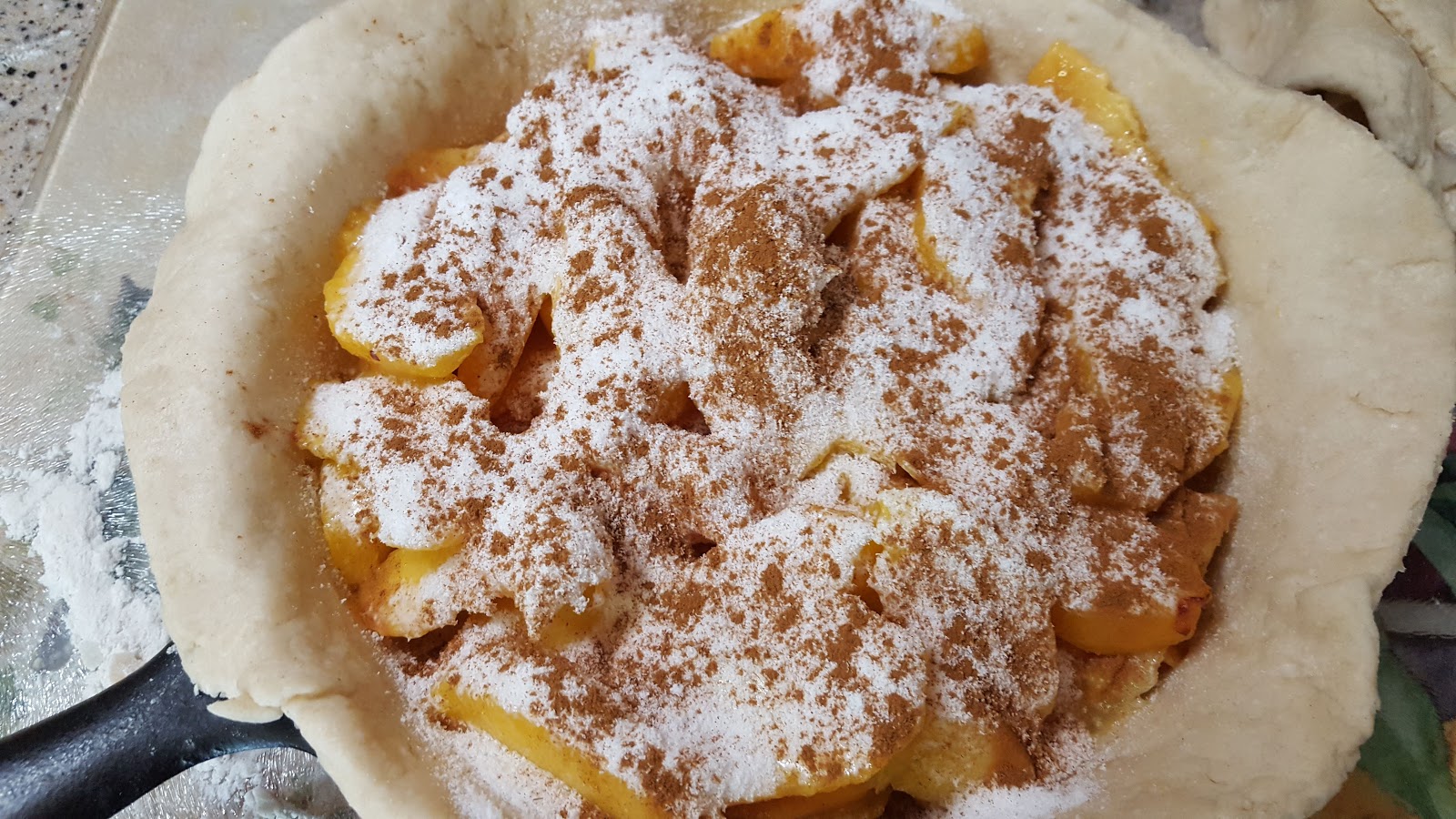 Mrs. Kolb's recipe didn't call for a particular size of skillet but did call for 8 peaches. I knew from experience that 8 peaches were going to make a really big pie. Since I wanted to make at least two dishes from my peaches, I just used my 8 - inch iron skillet and 5 peaches. I tried them in my skillet first to see if they would fill the skillet as much as I wanted to before I stopped at 5 peaches. You might want to do the same thing if you are using a different size skillet. Next time I will roll the dough thinner than what the recipe called for as I like my crust thinner. I always use stevia in place of sugar in recipes where they have you cover the fresh fruit with sugar. I like the taste of the fresh fruit to come through not a lot of sugar.
